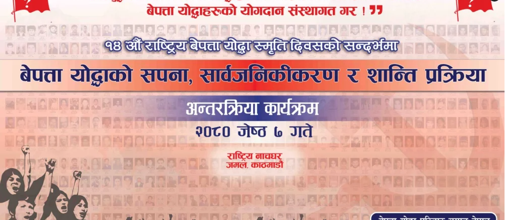 आज (७ जेठ) बेपत्ता योद्धा स्मृति दिवस मनाइँदै छ। बेपत्ता पारिएका व्यक्तिहरूको सम्मानमा बेपत्ता योद्धा परिवारले आइतबार दिउँसो १२ राष्ट्रिय नाचघर जमलमा कार्यक्रम आयोजना गरेको छ।